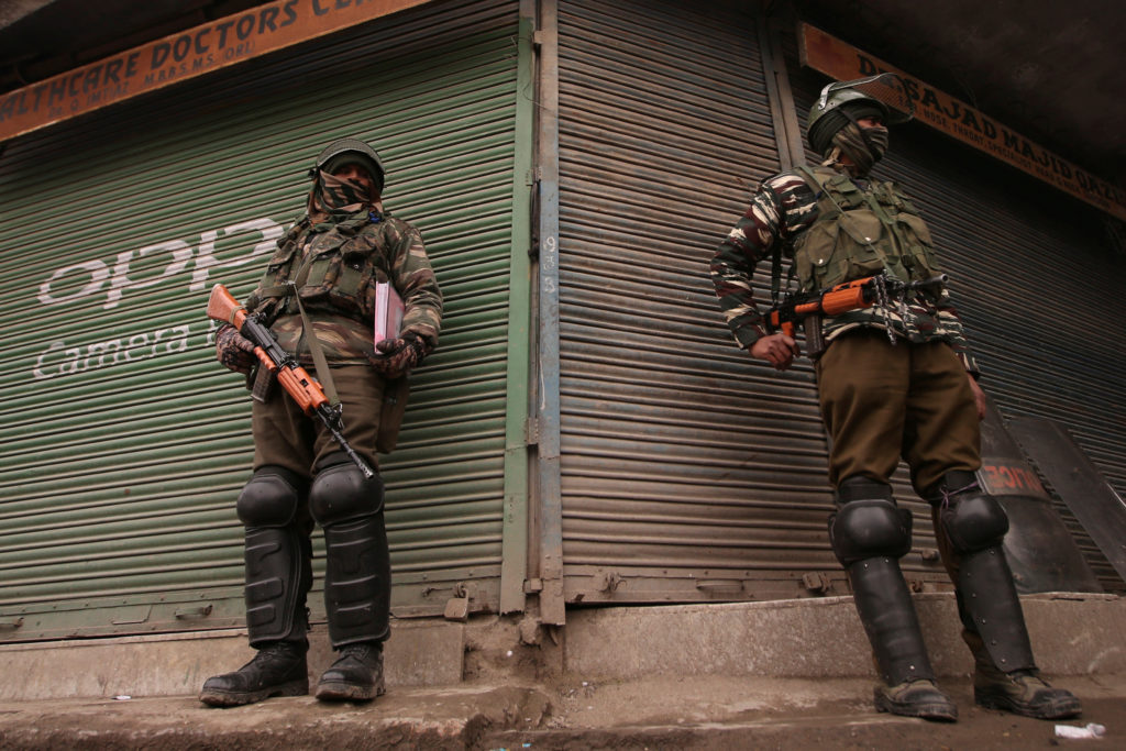 Indian Central Reserve Police Force (CRPF) personnel stand guard in front of closed shops in Srinagar, on Feb. 25, 2019. Photo by REUTERS/Danish Ismail