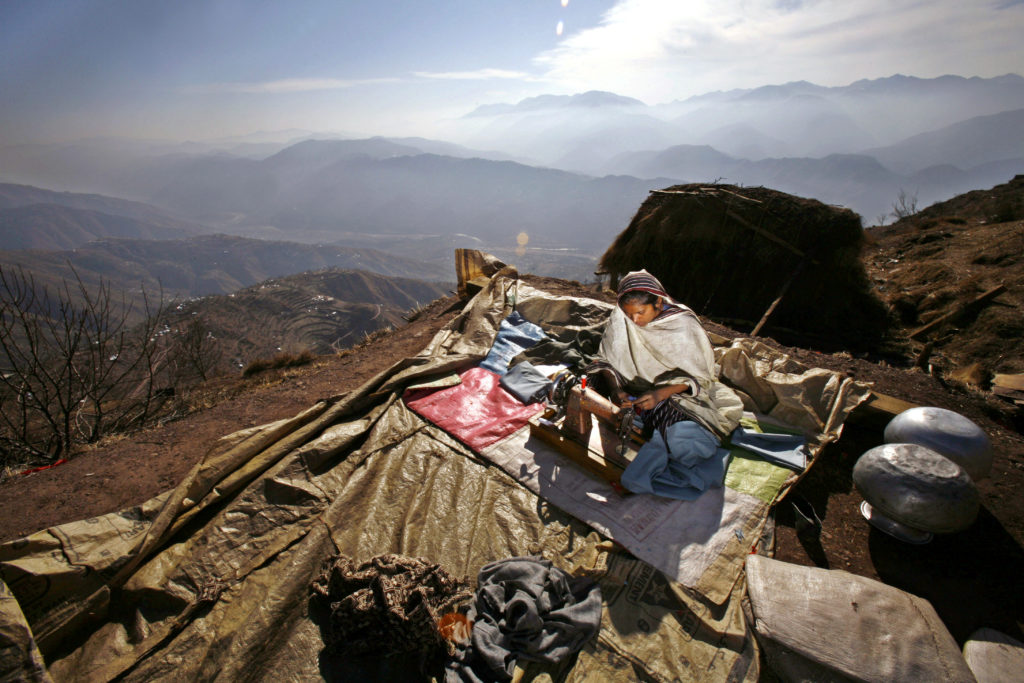 A Kashmiri earthquake survivor uses her sewing machine to sew up winter clothes, outside her shelter on the mountainous Buttlian area, outside the city of Muzaffarabad in Pakistan-administered Kashmir in 2006. File photo by REUTERS/Yannis Behrakis